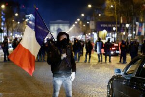 A protester waves a French flag on the Champs-Elysees avenue as cars try to block the traffic during their “Convoi de la liberte” (The Freedom Convoy), a vehicular convoy to protest coronavirus disease (COVID-19) vaccine and restrictions in Paris, France, February 12, 2022. REUTERS/Benoit Tessier