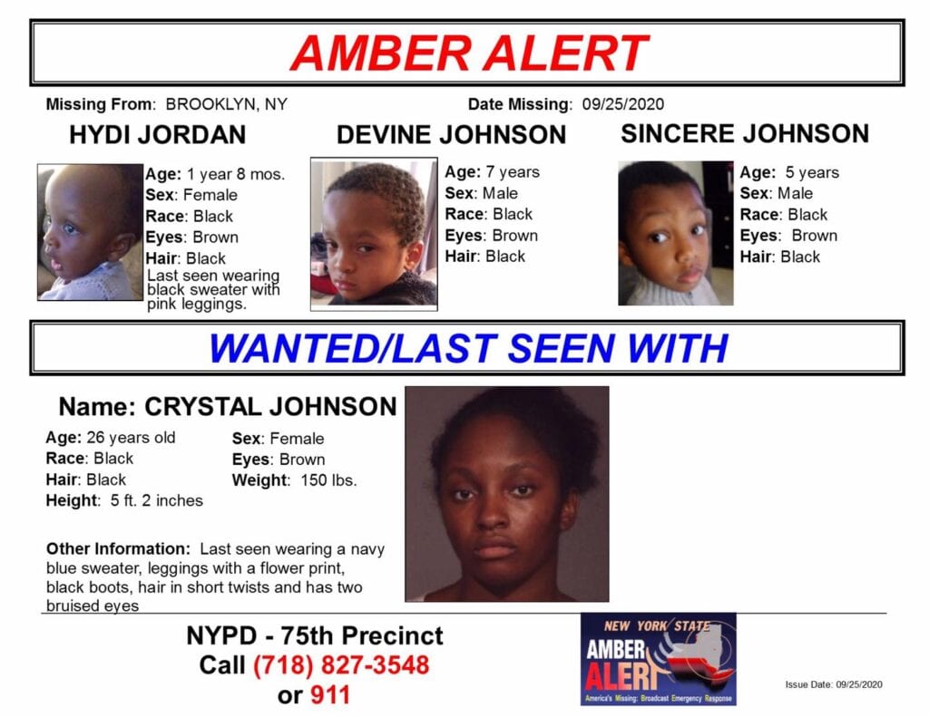The New York State Police is activating an AMBER Alert on behalf of the NYPD 75th Pct. The children were taken under circumstances that lead police to believe that they are in imminent danger of serious harm and/or death. If you have any information please contact the NYPD 75th Pct Detective Squad at 718-827-3548 or dial 911.
