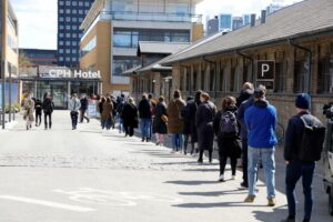 FILE PHOTO: People wait in line at a free coronavirus disease (COVID-19) antigen test centre, where getting to the front of the line took about an hour and a half, in central Copenhagen, Denmark, April 23, 2021. REUTERS/Tim Barsoe/File Photo