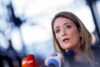 FILE PHOTO: European Parliament President Roberta Metsola speaks to the media as she arrives for a European Union leaders’ summit in Brussels, Belgium December 15, 2022. REUTERS/Johanna Geron/File Photo