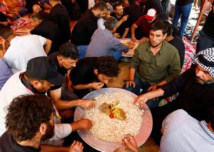 Supporters of Iraqi populist leader Moqtada al-Sadr eat lunch during a sit-in, at the parliament building amid political crises in Baghdad, Iraq July 31, 2022. REUTERS/Thaier Al-Sudani