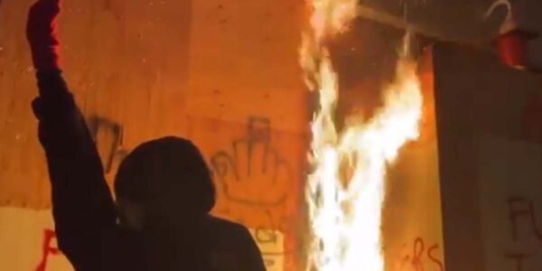 PORTLAND, OR – Chanting “Every city, every town. Burn the precinct to the ground”, leftist terrorists in Portland attempted to set fire to the federal ICE building with officers trapped inside. Police clashed with the protesters earlier. The fire was quickly extinguished and police used pepper spray to disperse the crowd.