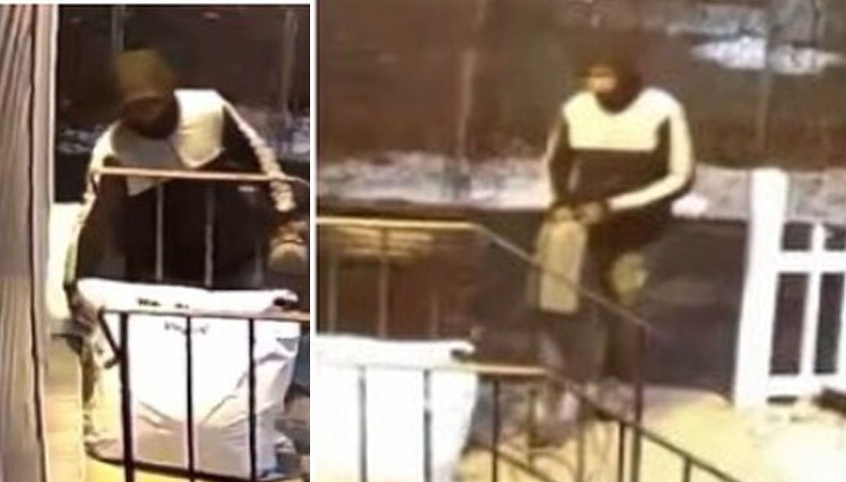 Surveillance footage shows the man removing a package from the front porch and leaving the area while traveling northbound on the same street.