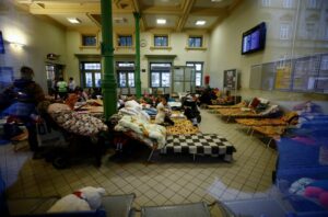 People rest in a temporary accommodation for refugees, after fleeing the Russian invasion of Ukraine, at the train station in Przemysl, Poland, March 4, 2022. Picture taken March 4, 2022. Picture taken through a glass window. REUTERS/Yara Nardi