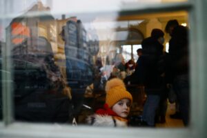 A child looks out of a window in a temporary accommodation for refugees, after fleeing the Russian invasion of Ukraine, at the train station in Przemysl, Poland, March 4, 2022. Picture taken March 4, 2022. Picture taken through a glass window. REUTERS/Yara Nardi