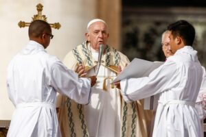 Pope Francis attends a mass to canonise two new Saints, Giovanni Battista Scalabrini and Artemide Zatti in St. Peter’s Square, at the Vatican, October 9, 2022. REUTERS/Guglielmo Mangiapane