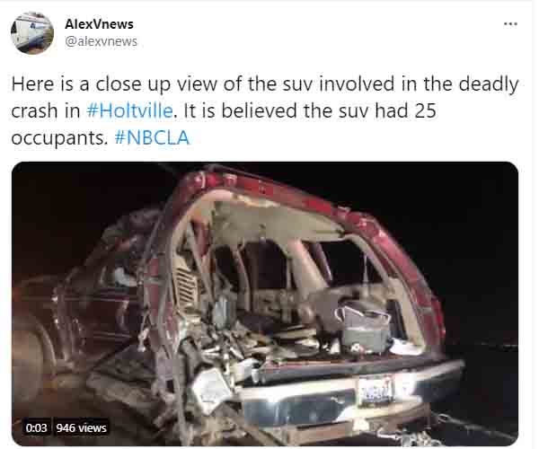 Holtville, CA – A Telemundo reporter on Tuesday night shared up and close video of the remains of the Ford Expedition that was packed with 25 Mexican migrants, 13 of whom died in a crash early that morning.