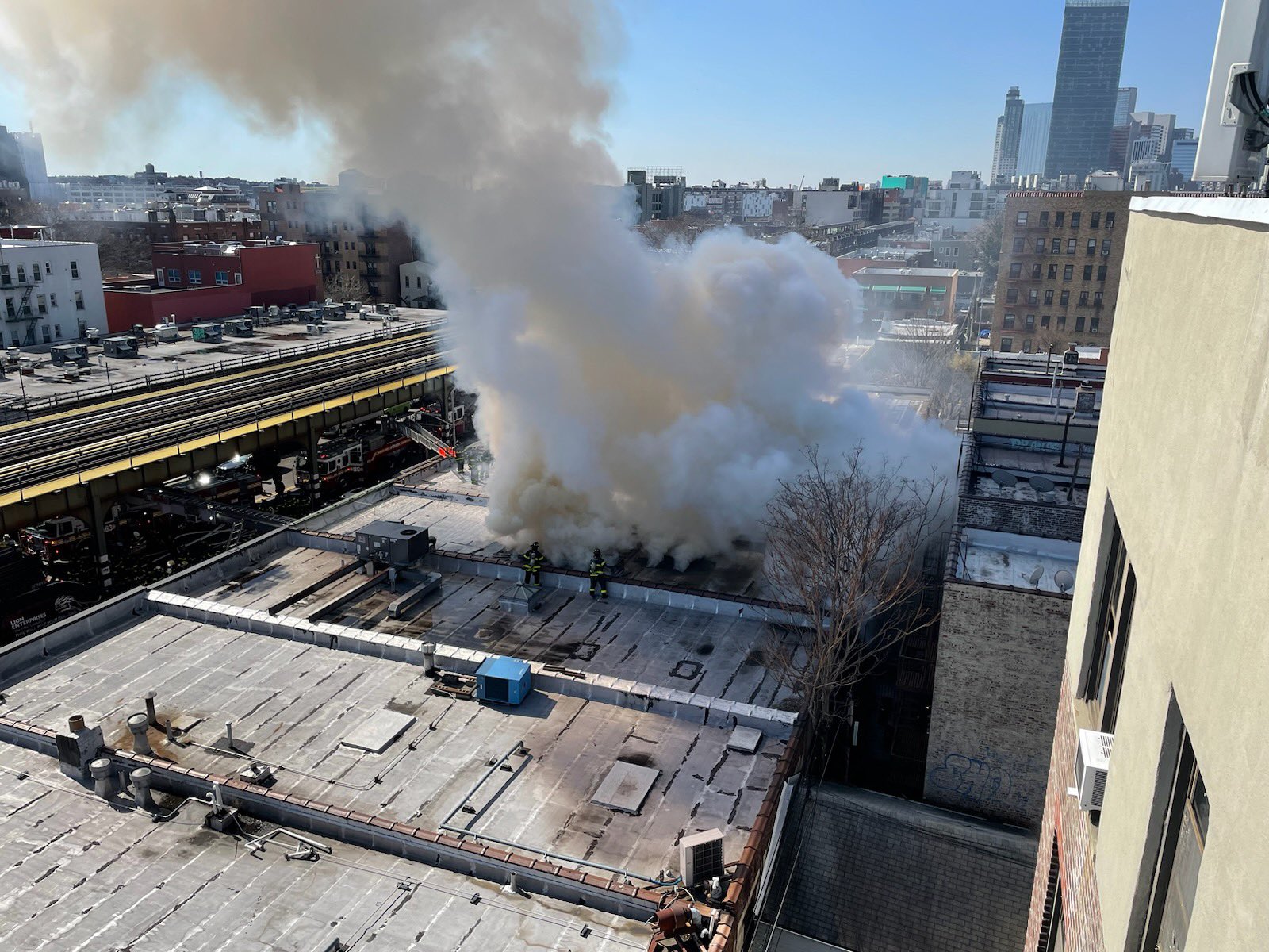 “We arrived at 10:15. Fire department units encountered heavy fire at this address. We quickly stretched hand lines, made searches, ventilated. The heavy fire condition, as you can see, the awning is all burned away. We gained entry. The warehouse is stacked from floor to ceiling with portable air conditioning units. So, we continue to put pockets of fire out,” said FDNY Deputy Assistant Chief Chuck Downey. “At this time. We have approximately 30 plus units on the scene, 150 fire and EMS personnel. We are at a third alarm, five minor injuries to Firefighters, one to civilian, and it’s going to be an extended operation due to amount of stock that, as you can see in this warehouse, roughly 20 by 80 feet deep.”