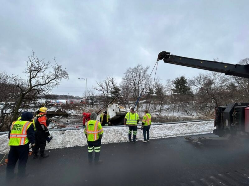 WEST DEPTFORD, NJ – Gloucester County emergency officials say two people were rescued after a commercial utility truck collided with a passenger vehicle and overturned into the Hessian Run Tributary along Route 295 northbound just before 7:30 a.m. Wednesday. The crash occurred near the on-ramp by West Deptford High School, leading to a large fuel spill and temporary highway closures.
